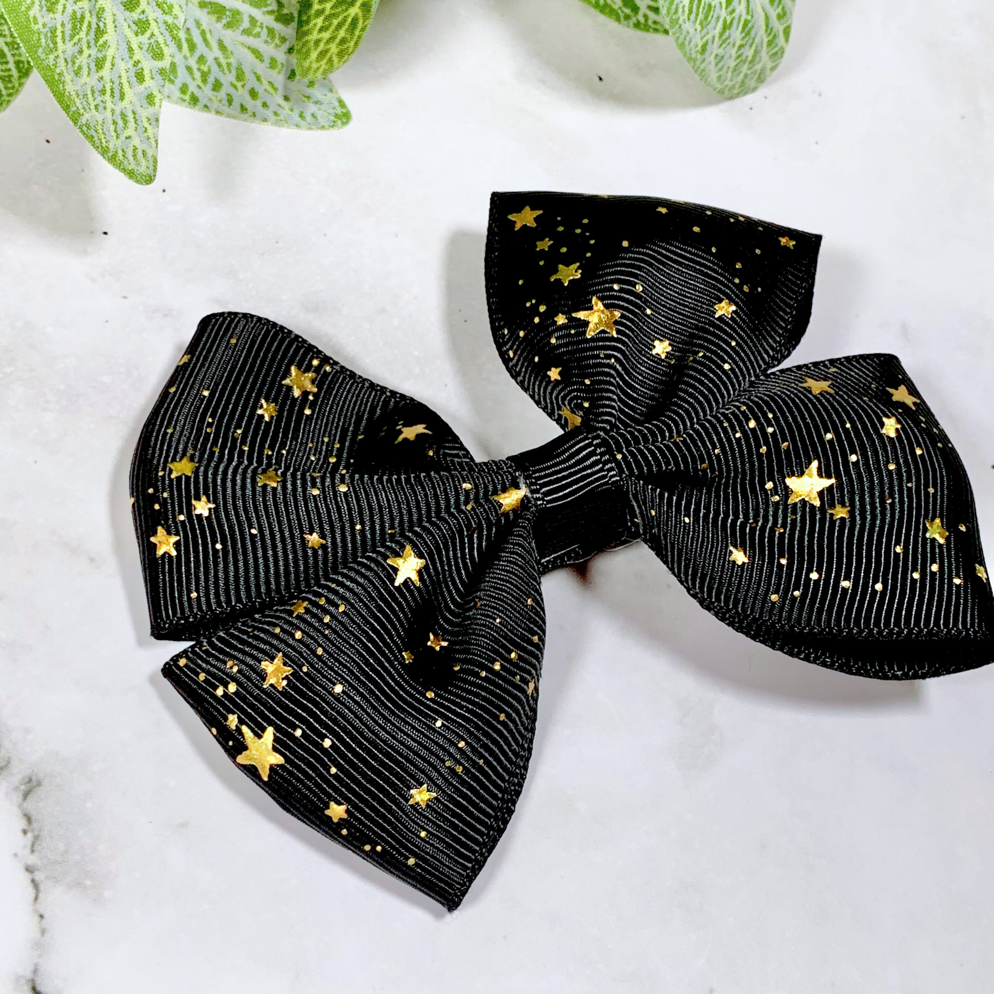 Black with Gold Foil Stars Medium Bow Hair Clip